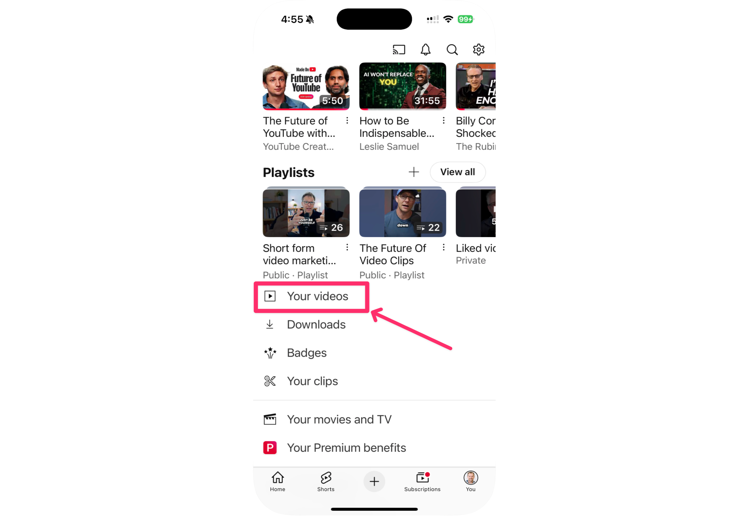 Go to the your channel on the YouTube app on your mobile, and tap on "Your videos".